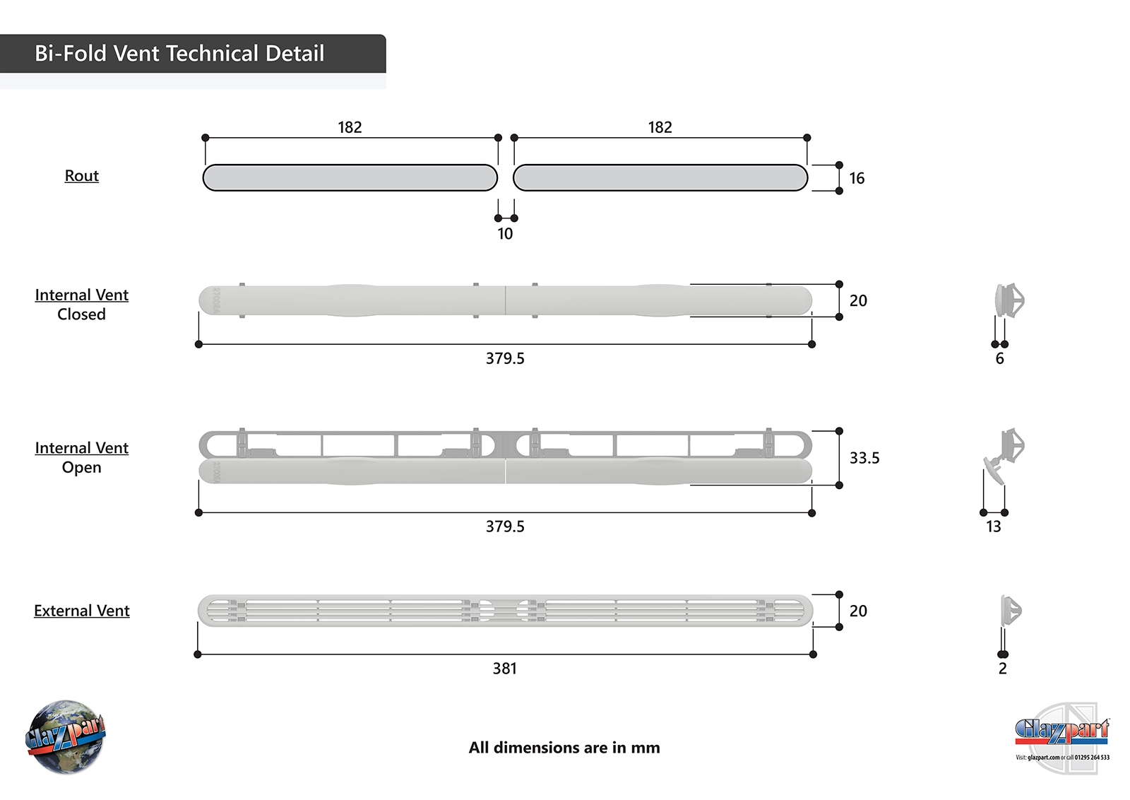 The Glazpart Bi-fold vent has a unique low-profile louvred canopy design combined with a low profile vent to allow both the internal vent and louvered grille clip in easily to sit between the open concertinaed door leaves.